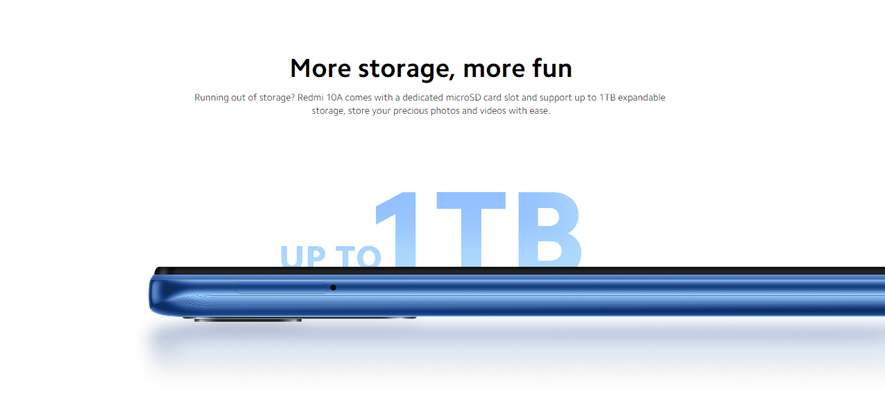 Redmi 10A comes with a dedicated microSD card slot and support up to 1TB expandable storage, store your precious photos and videos with ease.