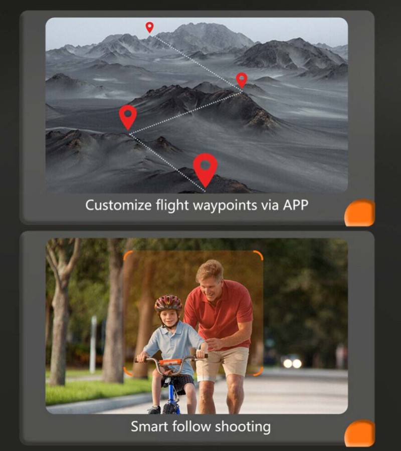 Aerial photography APP function: one-key takeoff/one-key landing/up/down/left/right turn/smart obstacle avoidance/smart follow/up and down ESC camera/360° roll/headless mode/fast/slow gear/photograph/video/switch dual Camera/face/gesture recognition automatic photo/gravity sensor/trajectory flight/positioning flight/one-key return to home.